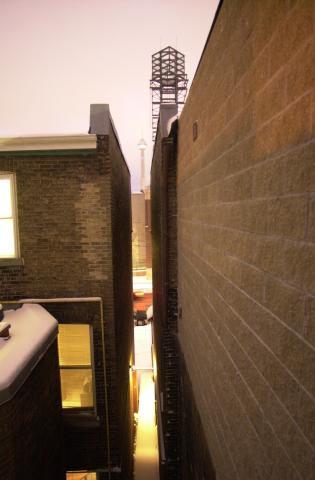 View facing up Dundas street (in direction of higher address numbers), across alley (e.g. 324 Dundas Street across the alley);