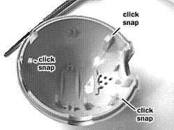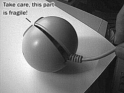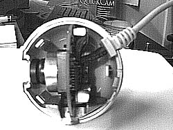 keeping the ball in a whole.A Note by William Lewis (wiml@omnigroup.com): "I'd just like to mention that I've ripped my QuickCam apart a zillion times (the first time I didn't know about the paper-clip-in-the-pinhole trick; I think I was one of the first people to mention it on the mailing list) and have broken off two of the three clips that hold the ball together, but it stays together just fine by friction. So it's not quite the end of the world if you're a little clumsy taking it apart." |