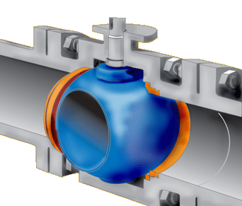 When the ball is turned so the hole runs along the pipe, the valve is turned on, as shown rightmost above.