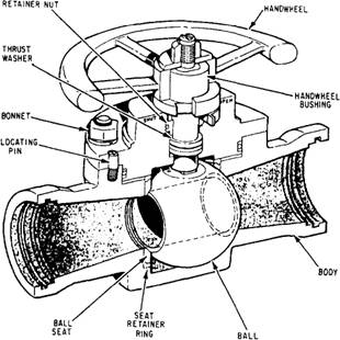 A ball valve is a valve that controls the flow of water using a ball that has a hole drilled through the ball. When the ball is turned so the hole is at a right angle (90 degrees) from the flow pipe, the water is shut off, as shown leftmost below: