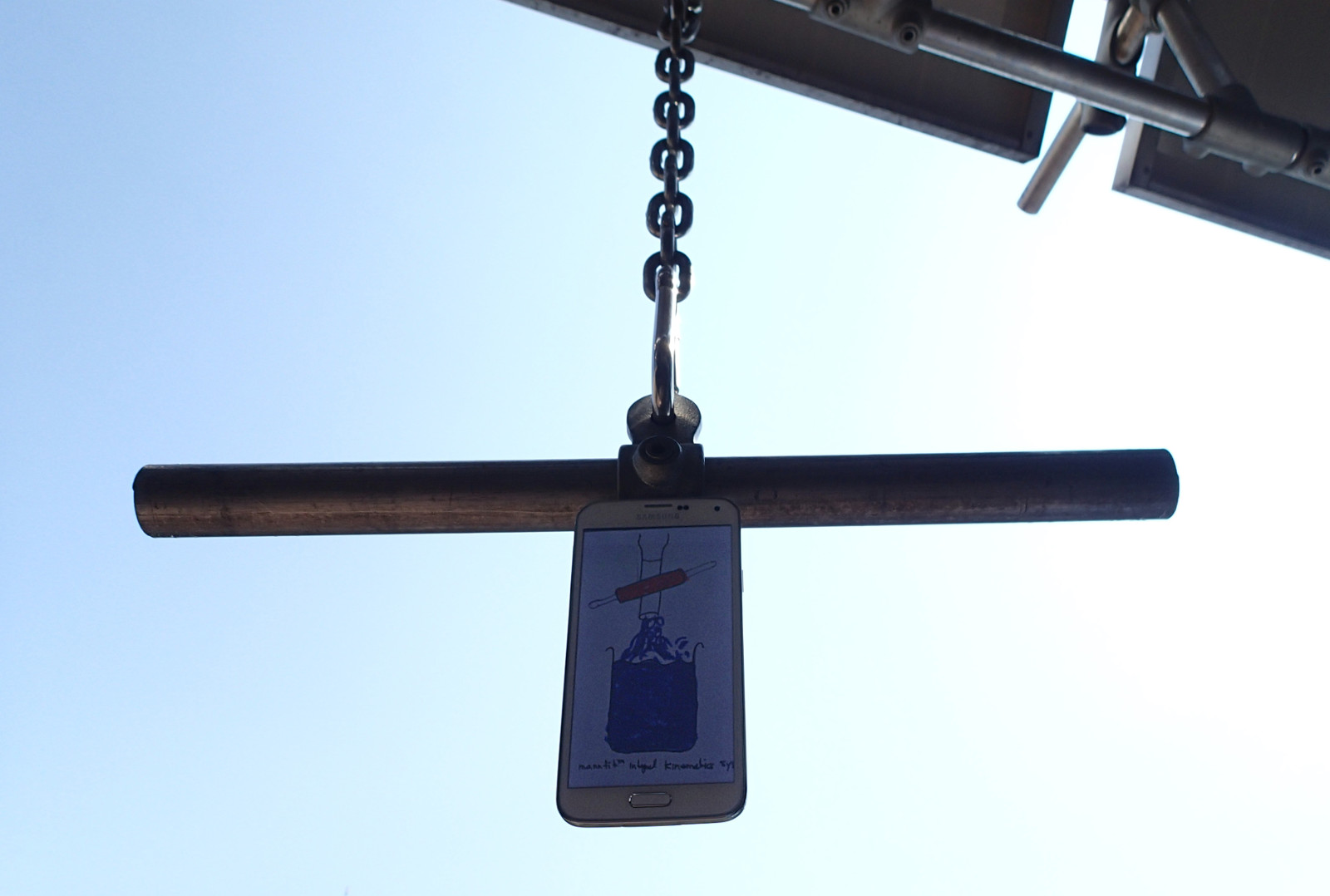 The fitness bar has a mounting bracket to which the user affixes a smartphone running the Mannfit app.
